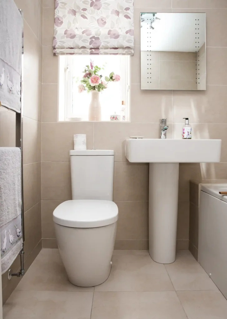 When you have zero cabinet space, utilizing the vertical area above the toilet is the smartest move. Install 2-3 sturdy floating shelves. Use the top one for purely decorative items—maybe a small piece of art or a plant—and the bottom one for functional items like neatly folded hand towels or a small basket holding the must-have toiletries for an overnight guest bath.